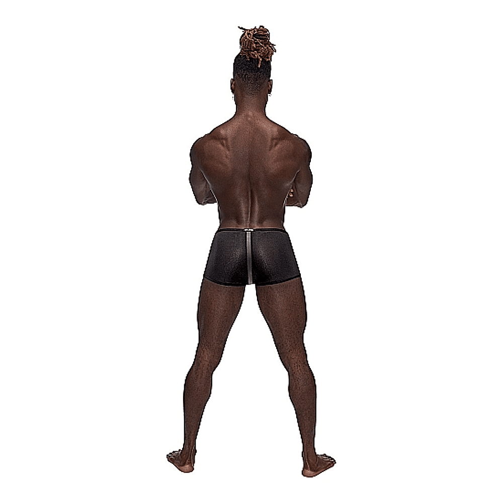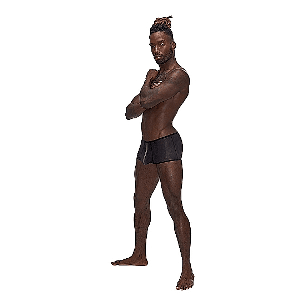 Issu de la collection Landing Strip de Male Power, ce boxer est doté d'une fine garniture élastique en peluche à la taille et aux jambes, d'une bande en onyx mat ton sur ton et d'une étiquette métallique décorative sur la ceinture arrière.