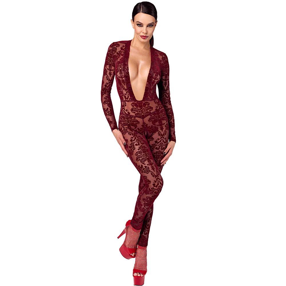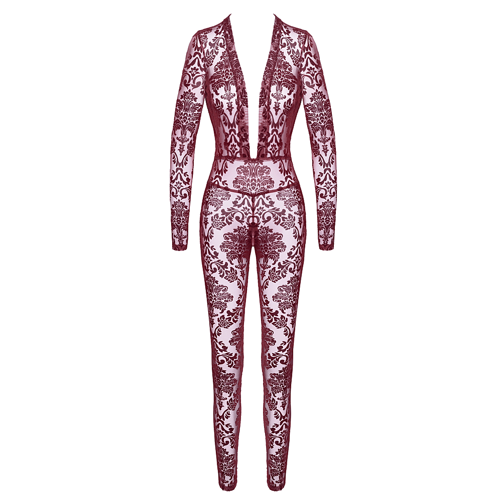 Une magnifique combinaison en tulle floqué bordeaux avec un décolleté en V profond et une fermeture éclair à l'entrejambe pour plus de commodité.