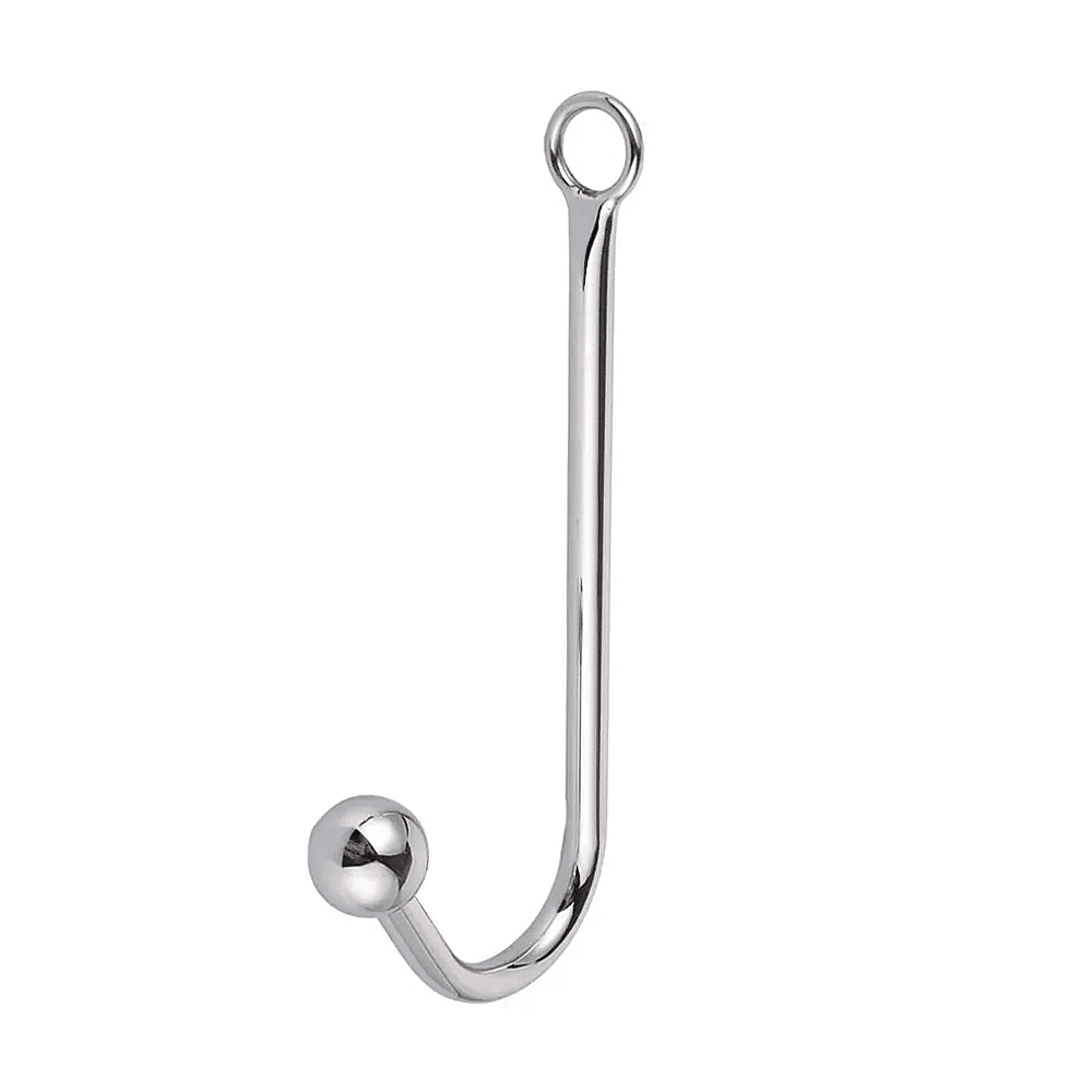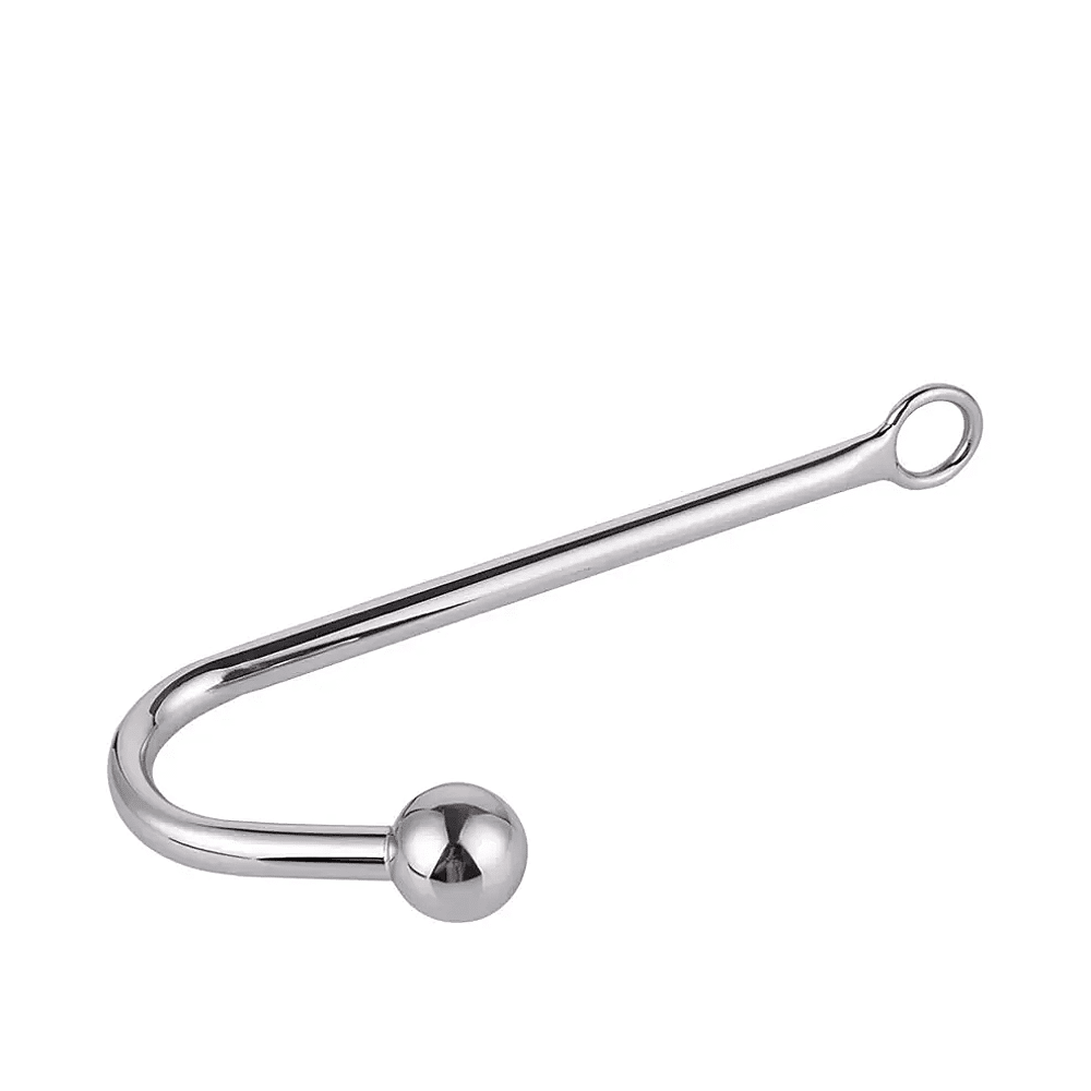 Crochet anal métallique avec une boule à un extrémité et un anneau à l'autre.