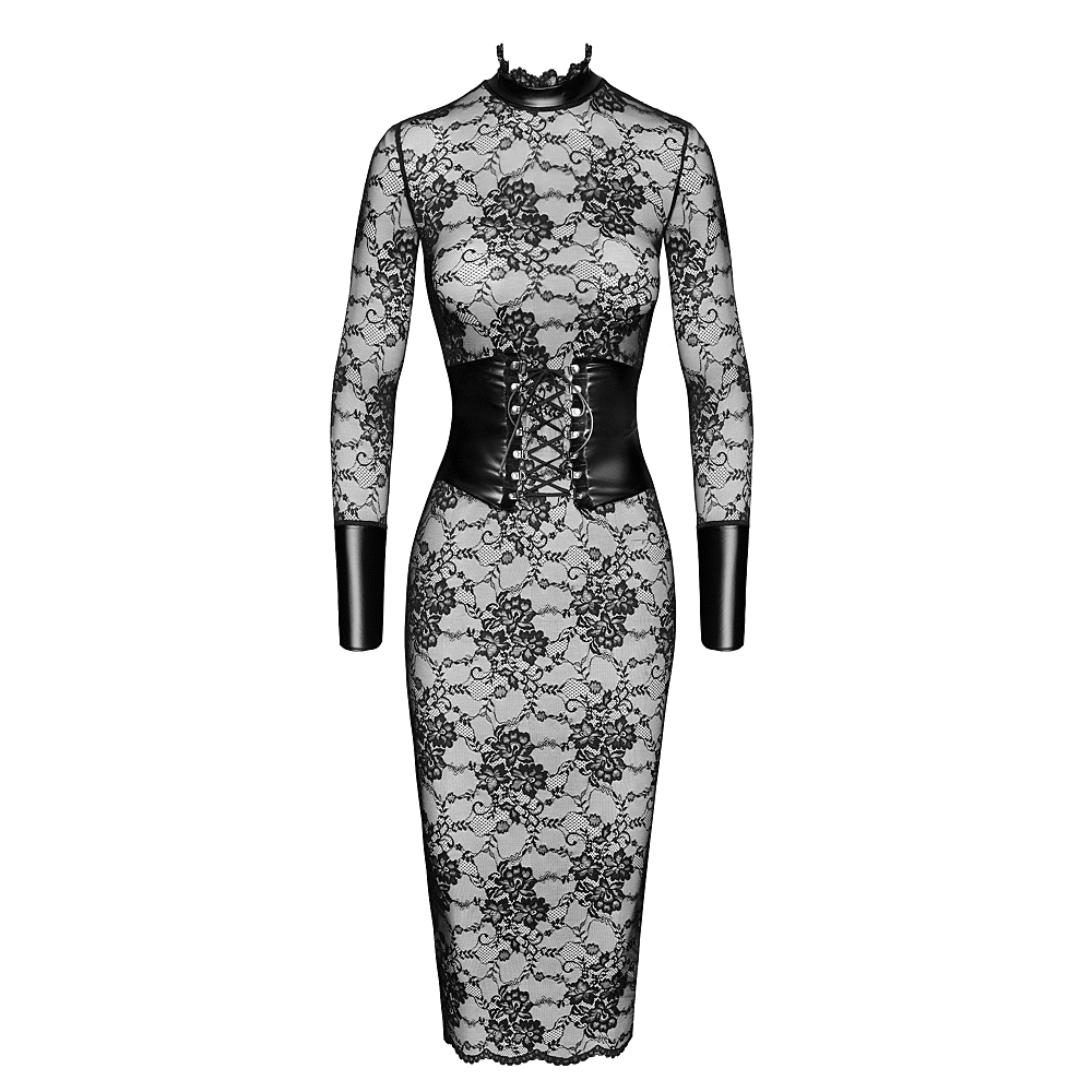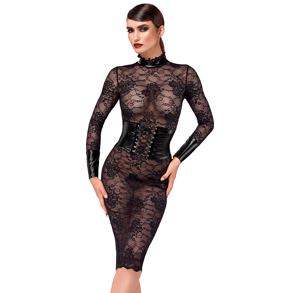 Une magnifique robe en dentelle noire avec un col montant, des poignets larges et un corset intégré.
