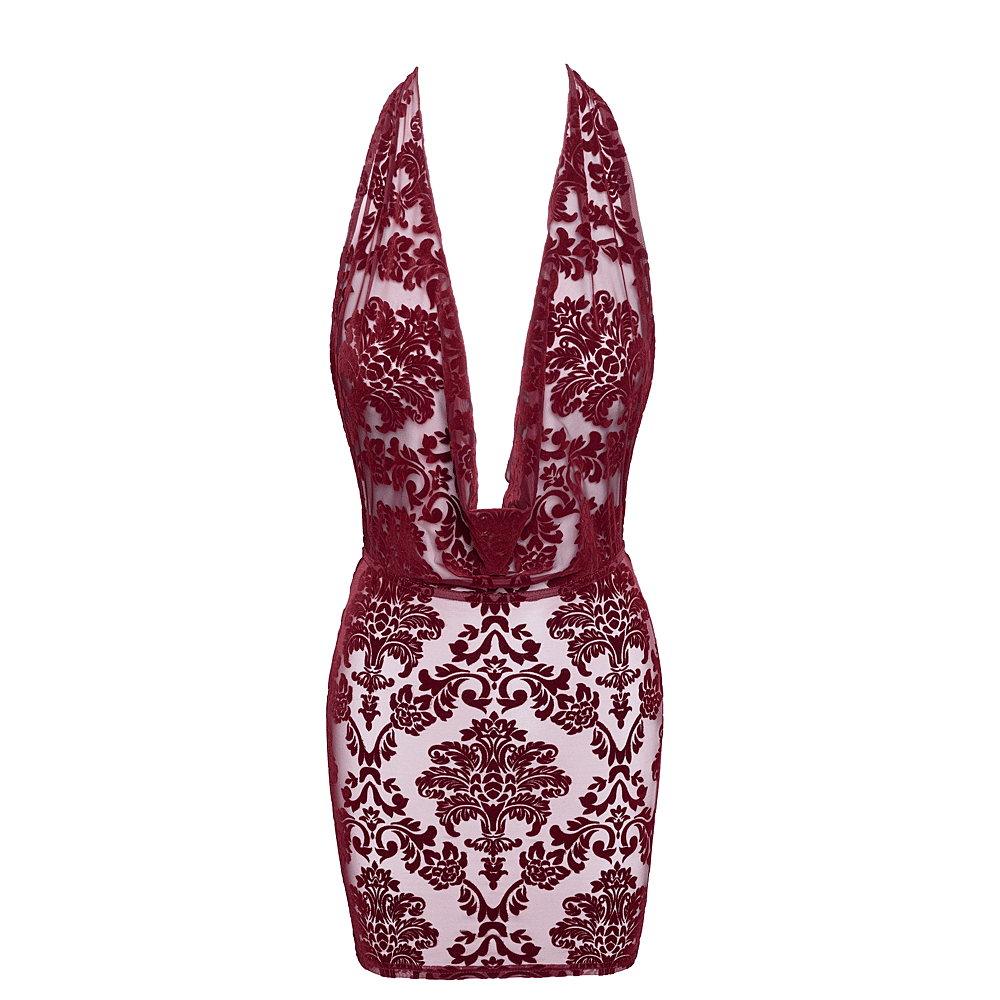 Elégante et sensuelle robe courte en tulle floqué bordeaux avec un dos nu et une encolure drapée.