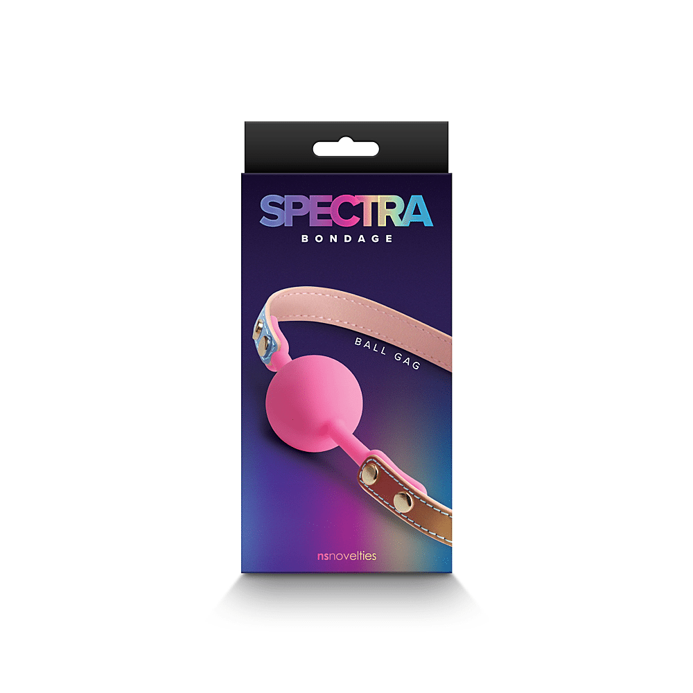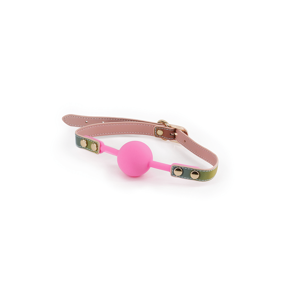 Mooie, hoogwaardige bal gag met veelkleurige band, roze bal en goudkleurige metalen details.