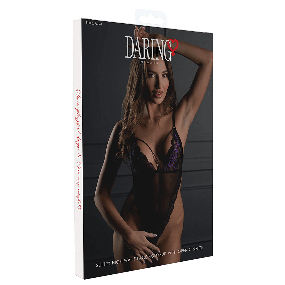 De uitgesneden snit laat je benen goed uitkomen, terwijl het transparante paarse kant zich aan al je rondingen aanpast.