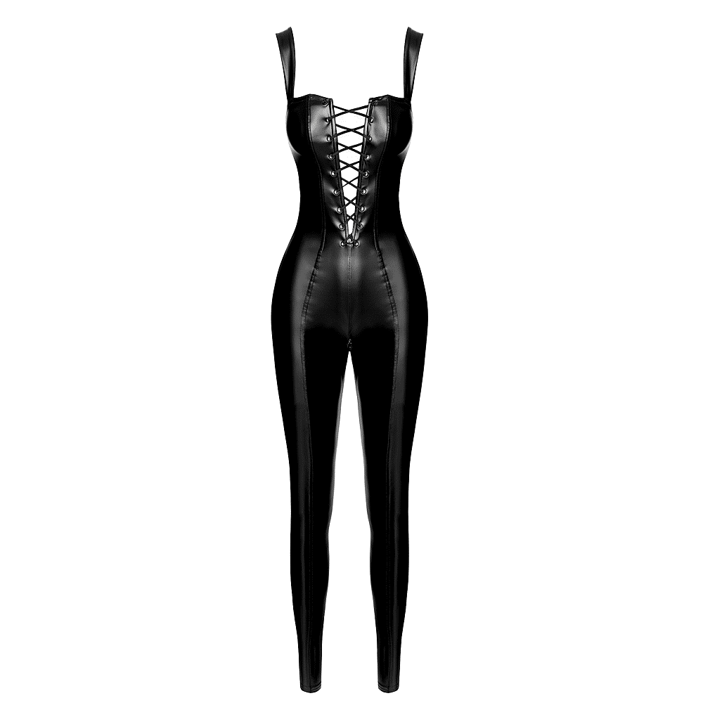 Een jumpsuit uit zwarte wetlook-stof vervaardigde wetsuit met brede, soepele bandjes.De halslijn is diep uitgesneden en kan met veters worden aangepast.