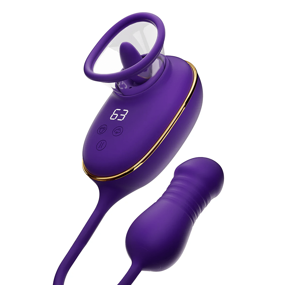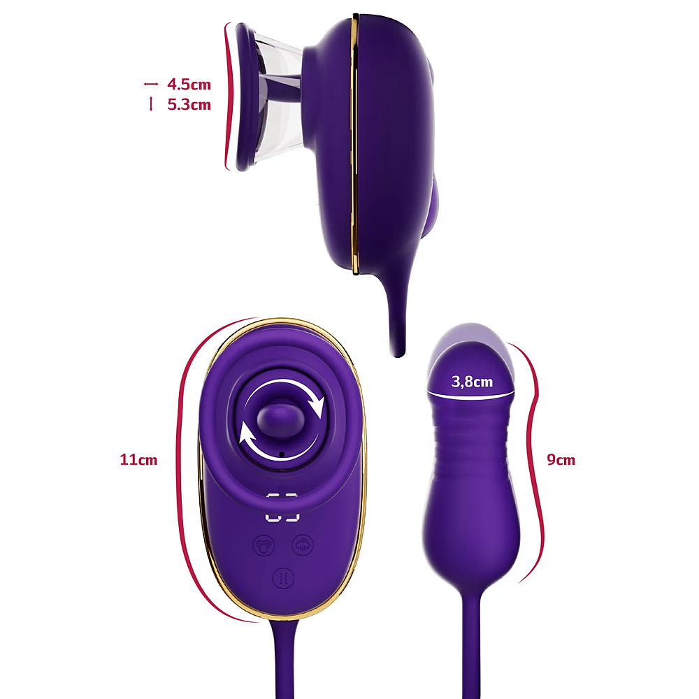 Dit innovatieve ontwerp combineert drie krachtige functies om de clitoris te stimuleren: zuigen, likken en vibreren. Het is gecombineerd met een dynamische anale stimulator om nog meer erogene zones te prikkelen.