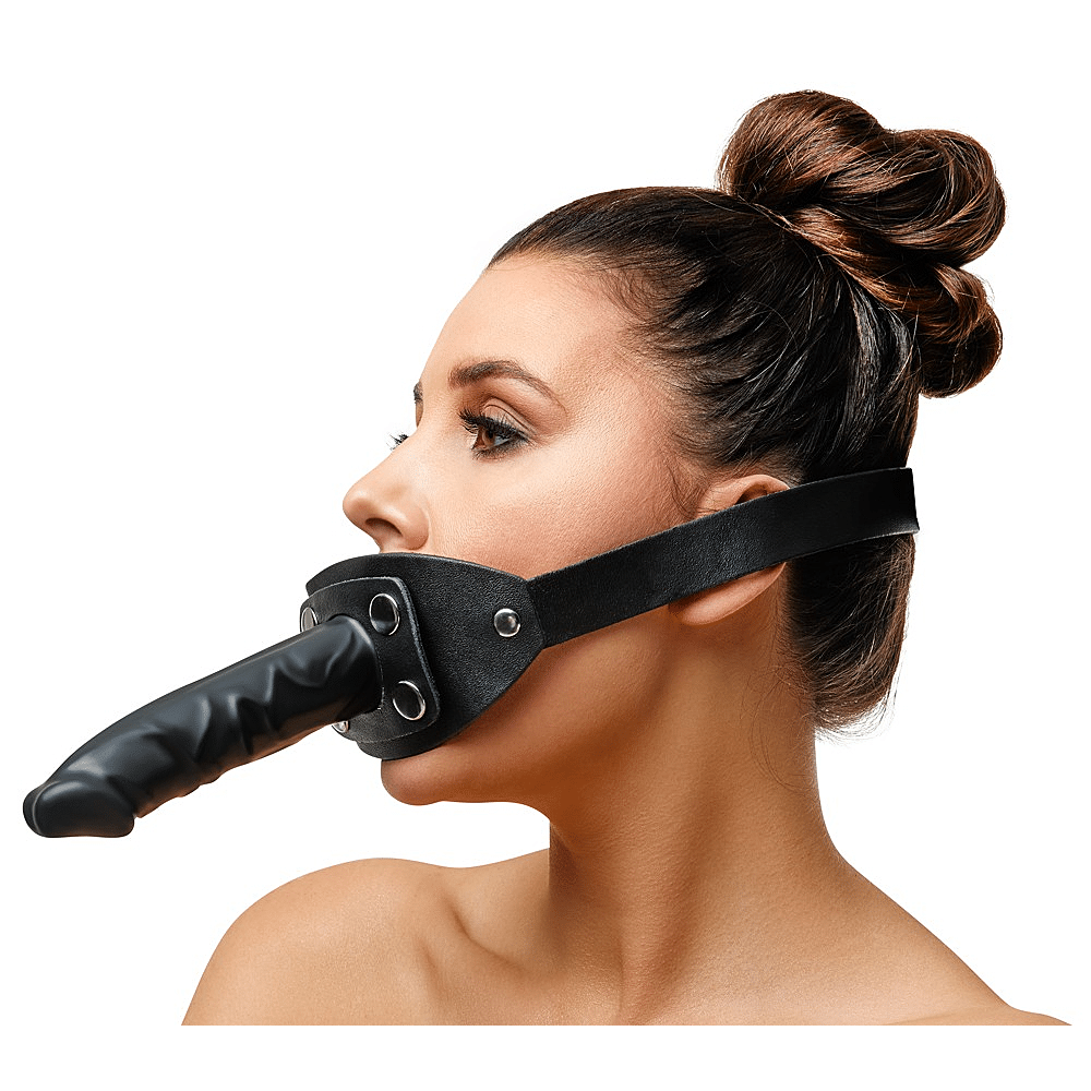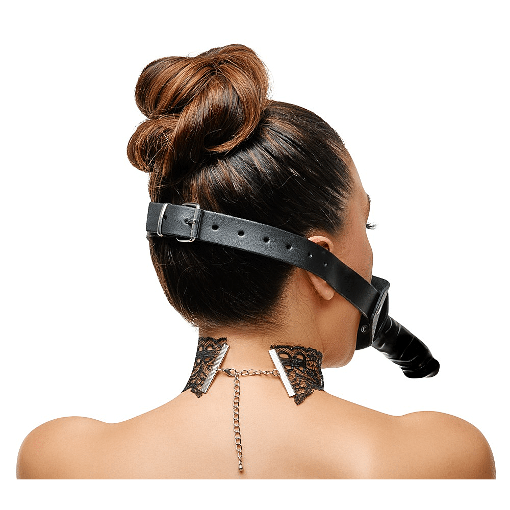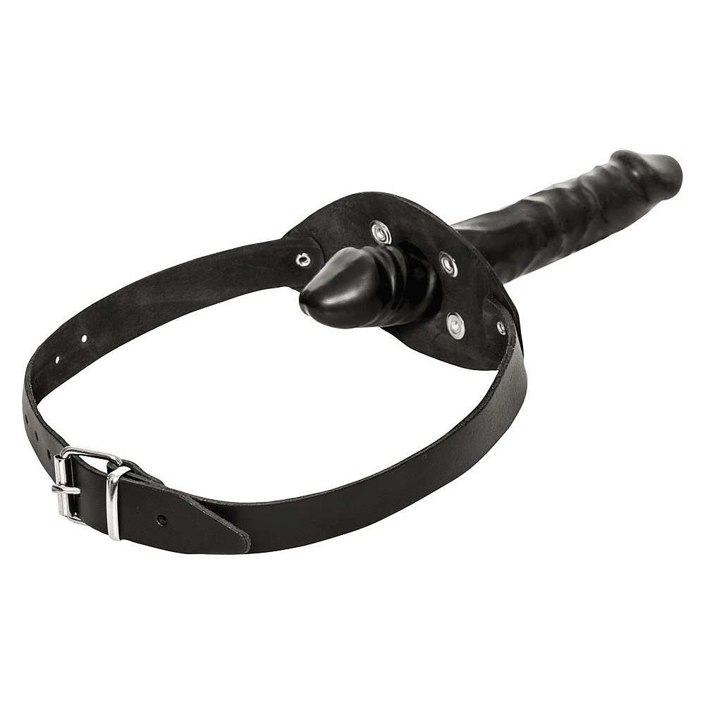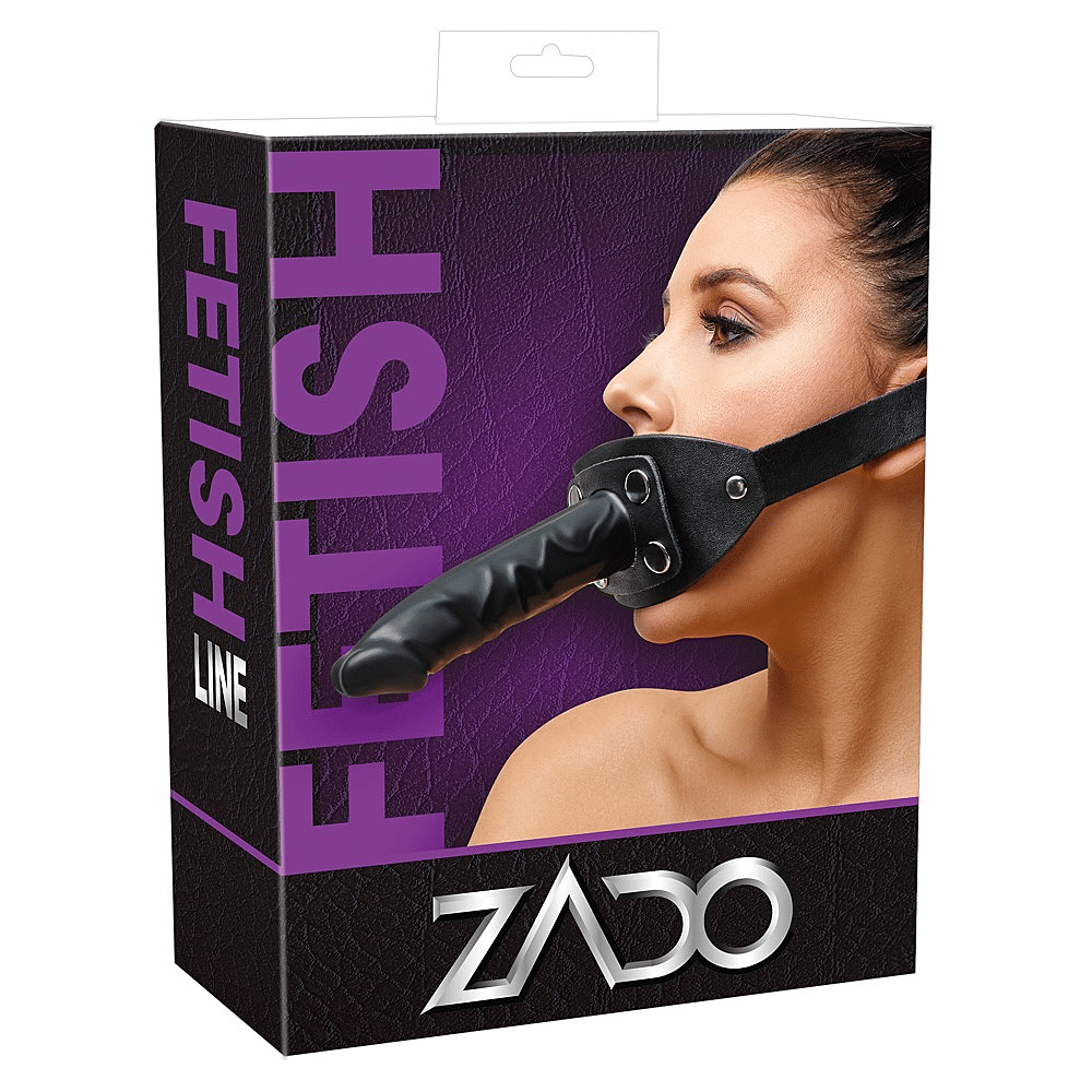 Deze ZADO gag bestaat uit een verstelbare lederen band, een dildo aan de buitenkant en een kleinere dildo aan de binnenkant.