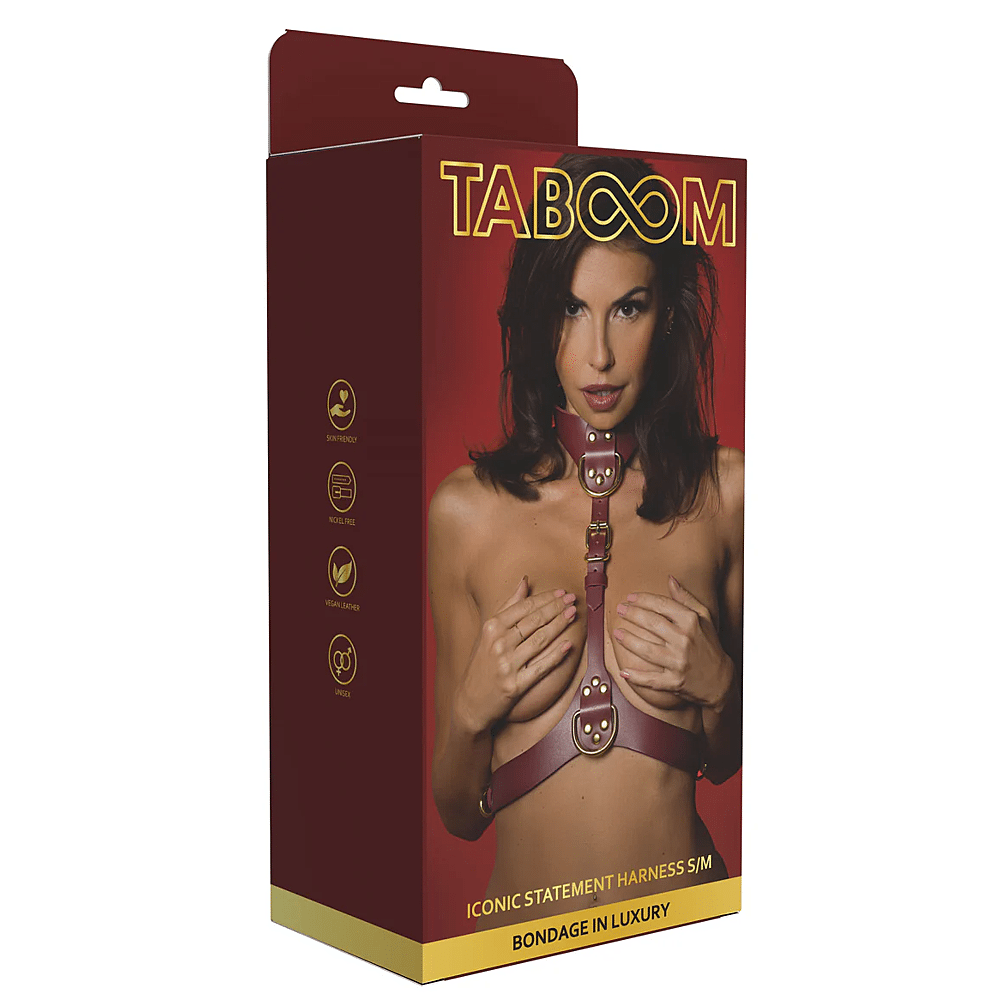 Dit harnas is gemaakt van kunstleder met gouden details en wordt om de nek en onder de borsten gedragen om je rondingen te accentueren.