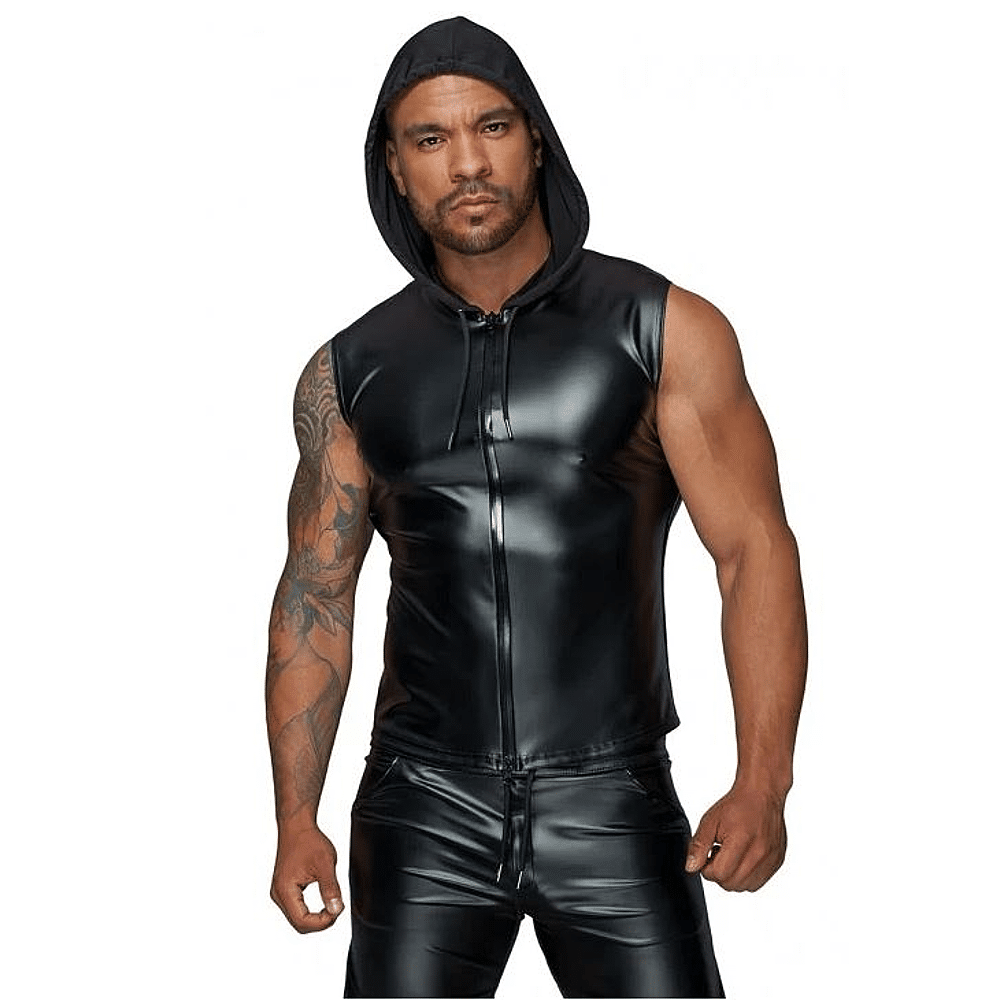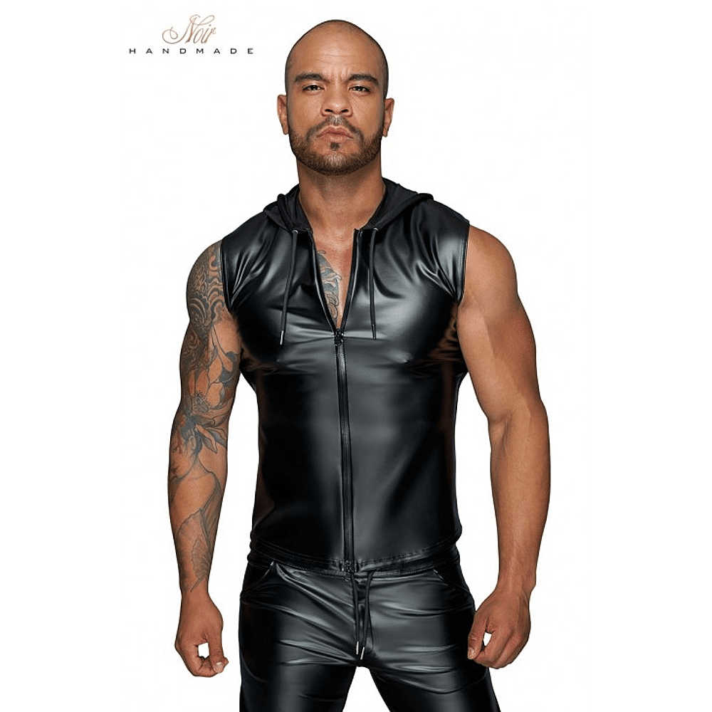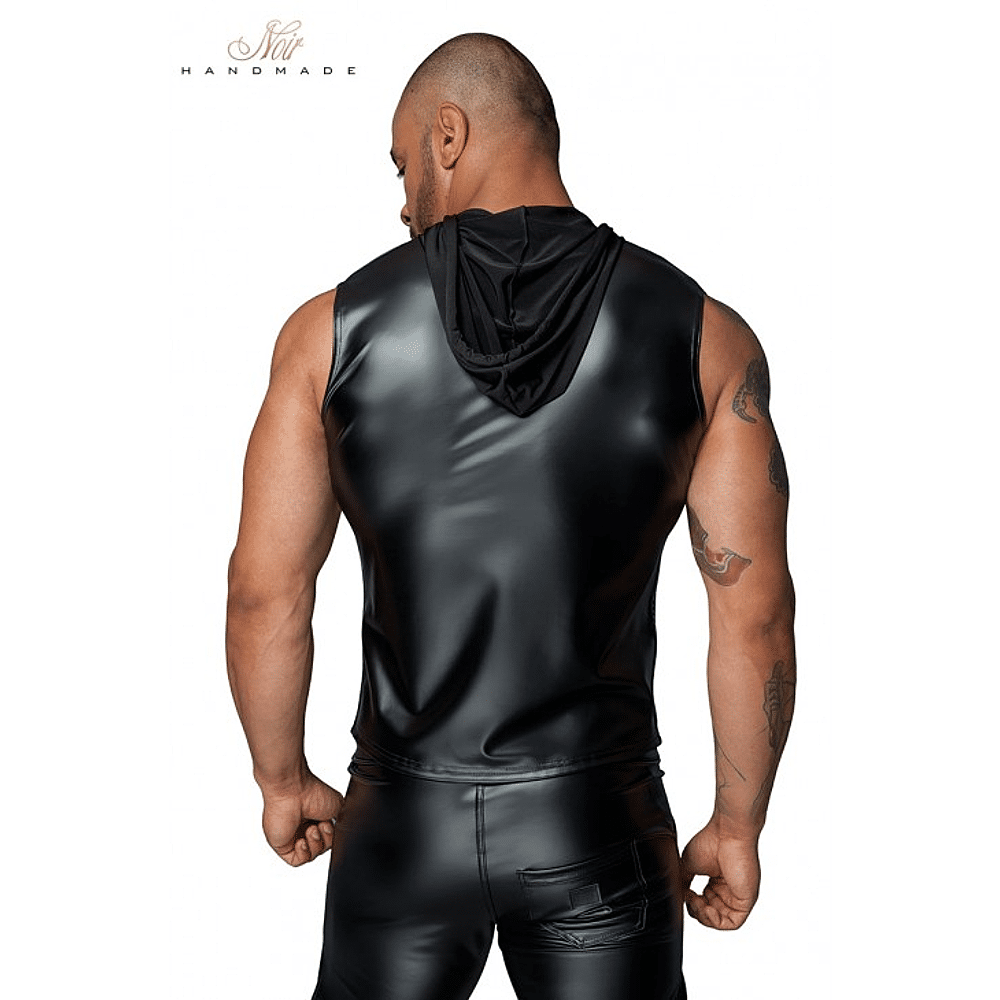 Mouwloos shirt met capuchon en een tweewegritssluiting aan de voorkant.