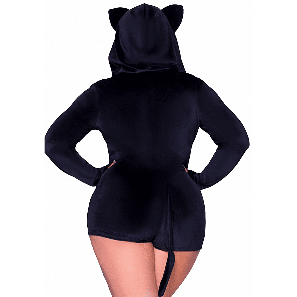 Kattenkostuum bestaande uit een ultrazachte fluwelen jumpsuit met rits en bel, een capuchon met oren en een kattenstaart.