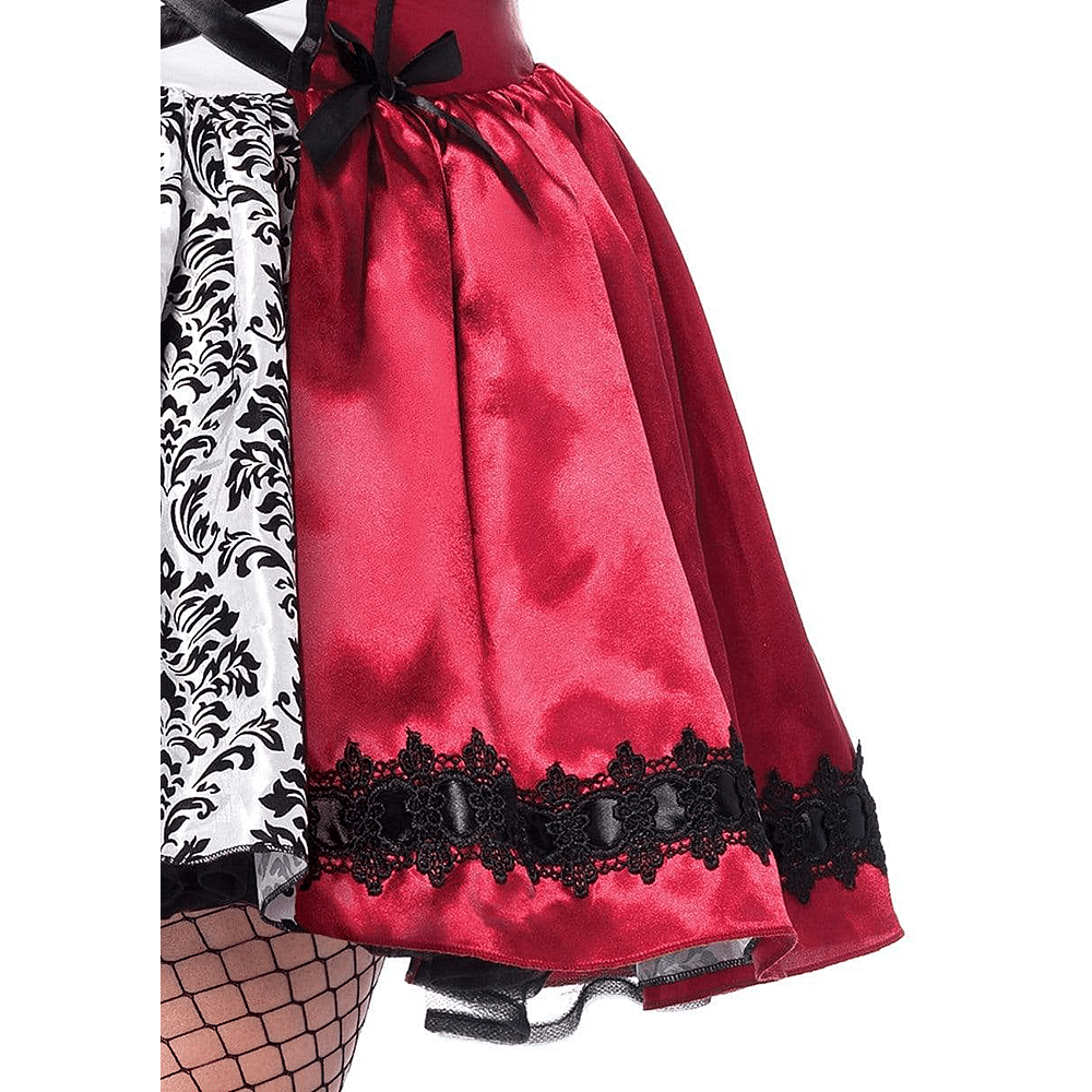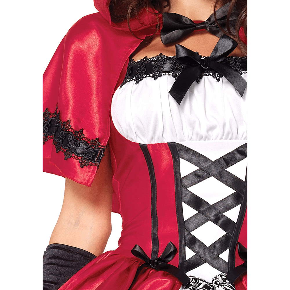 Roodkapje kostuum bestaande uit een satijnen mini jurkje met kant geborduurd Venetiaans lint en een cape met kap.