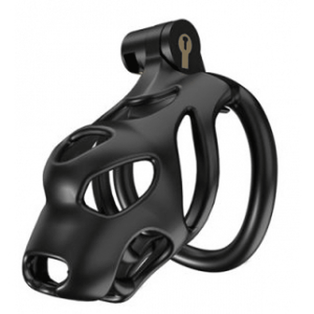 Zwarte kuisheidskooi met een originele design in de vorm van een hondenkop.