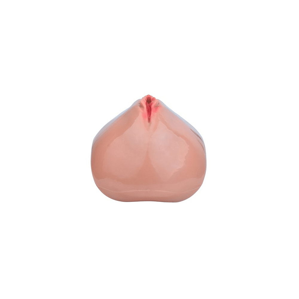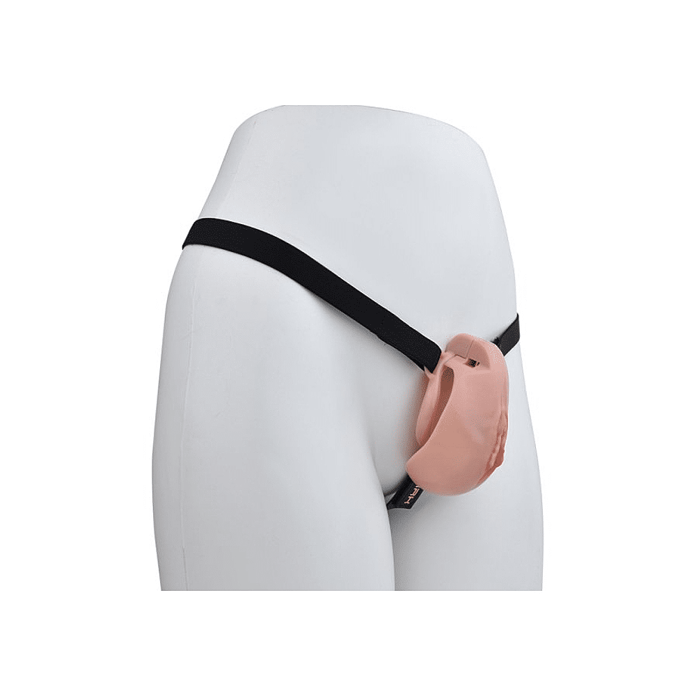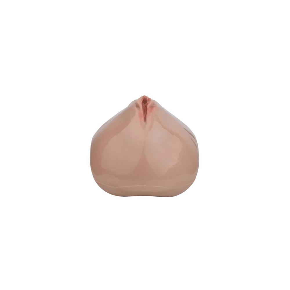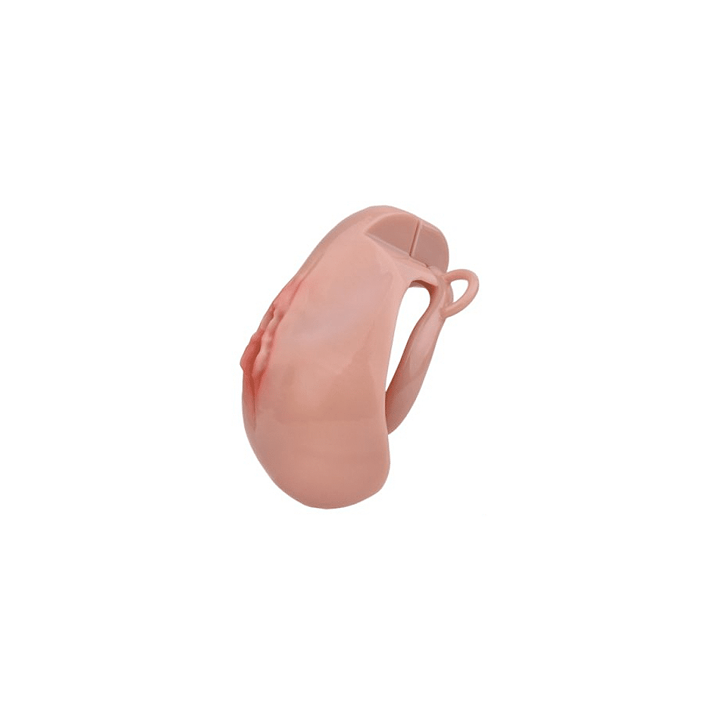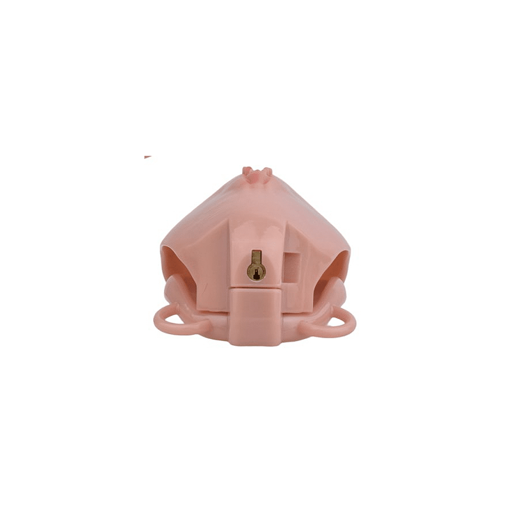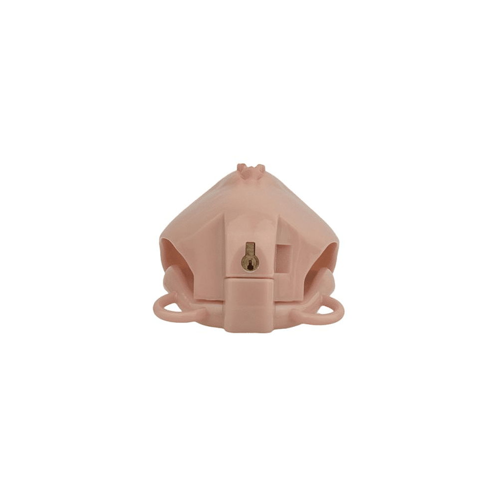 Een kuisheidskooi in de vorm van een vulva, verbonden met een verstelbaar harnas.