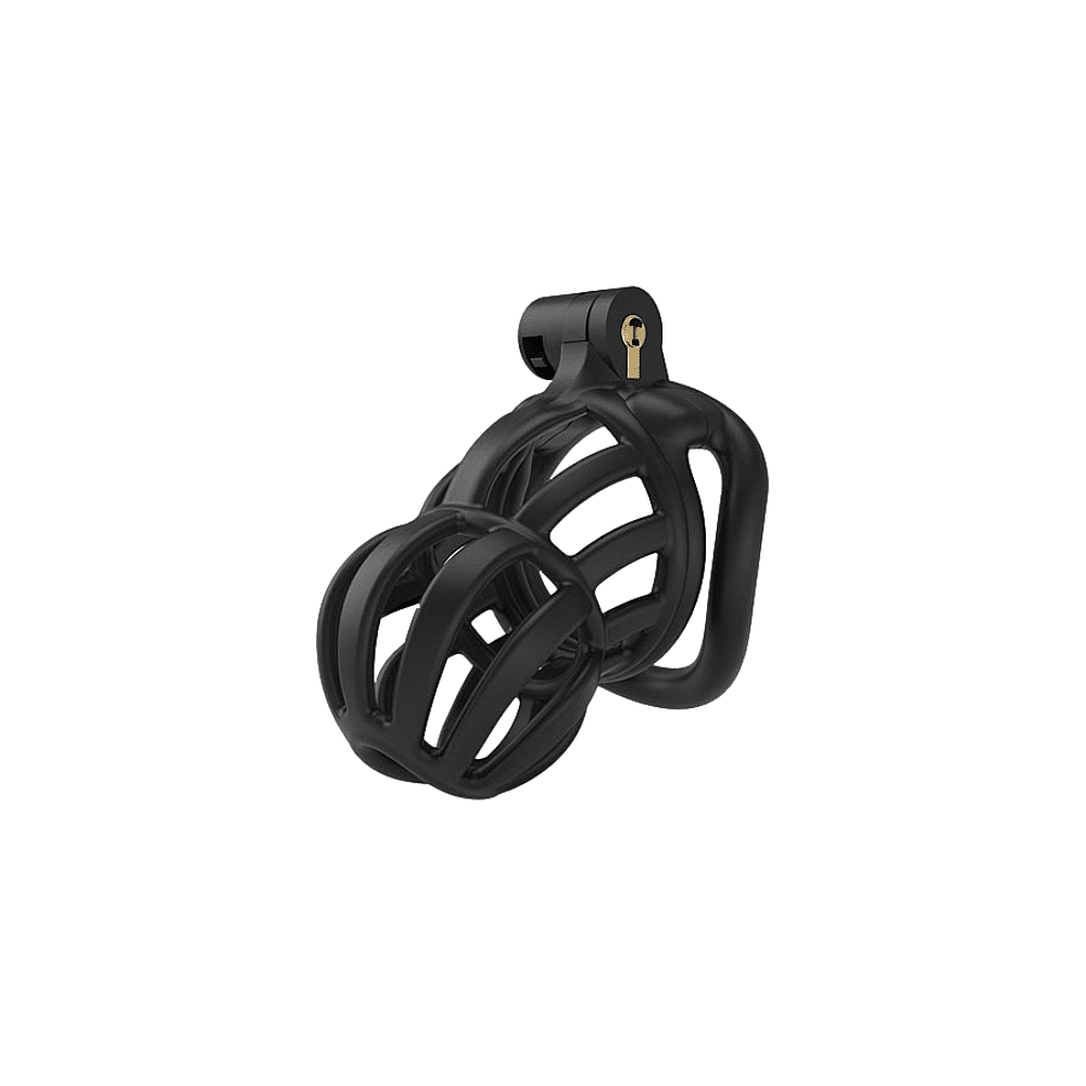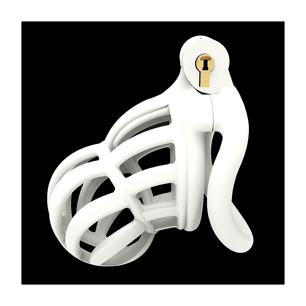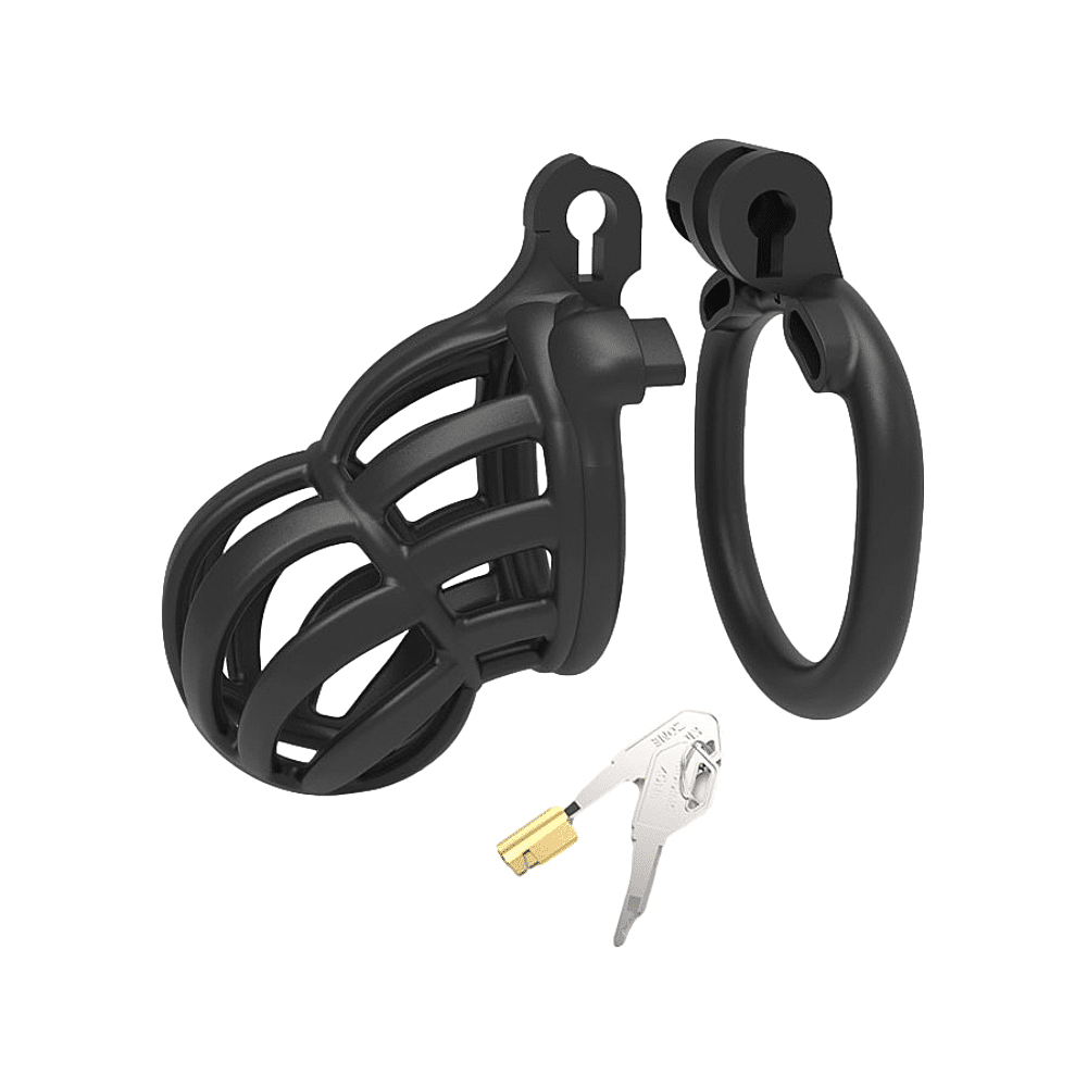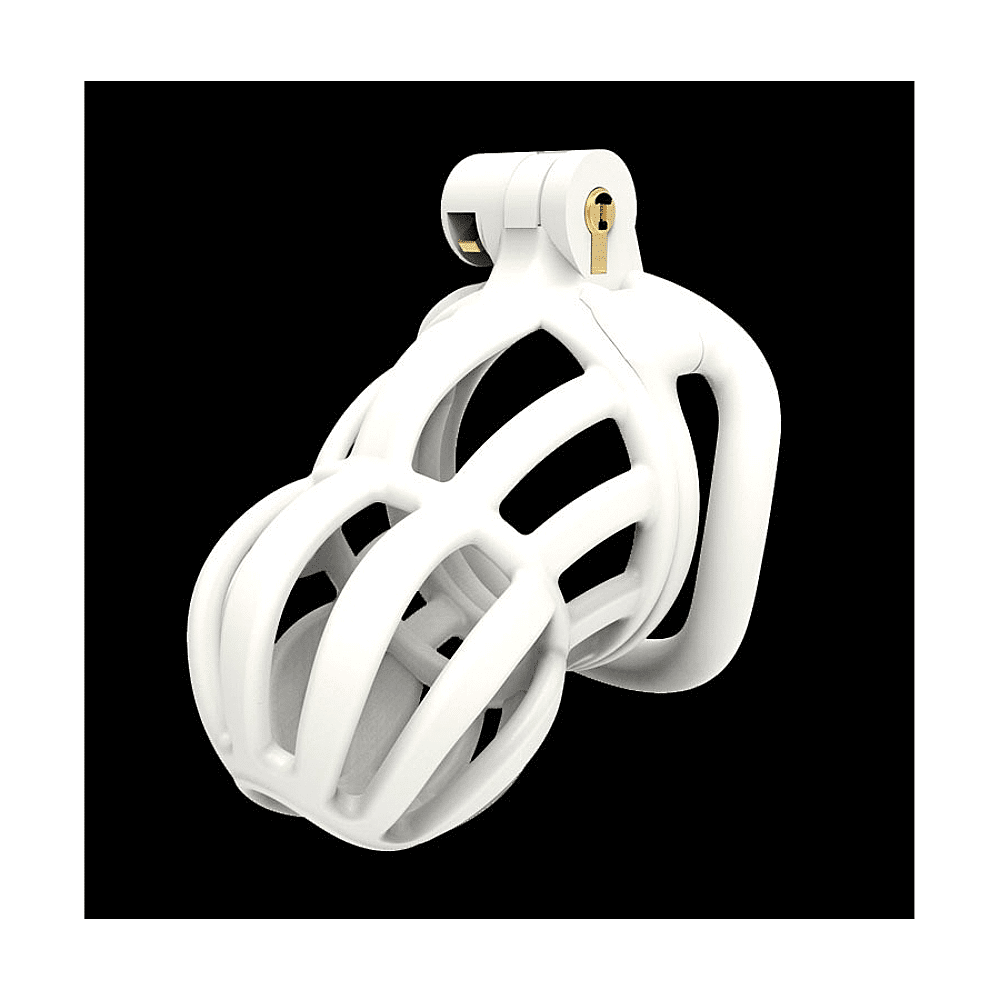 Deze plastic kuisheidskooi heeft een slot en is open aan het uiteinde om plassen mogelijk te maken.