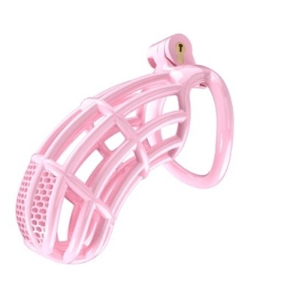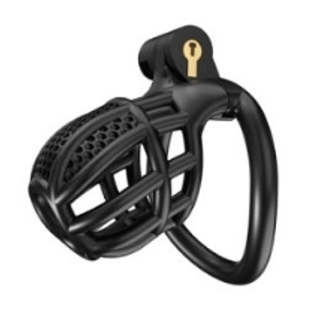 Geventileerde kuisheidskooi van hard zwart plastic en voorzien van een slot.