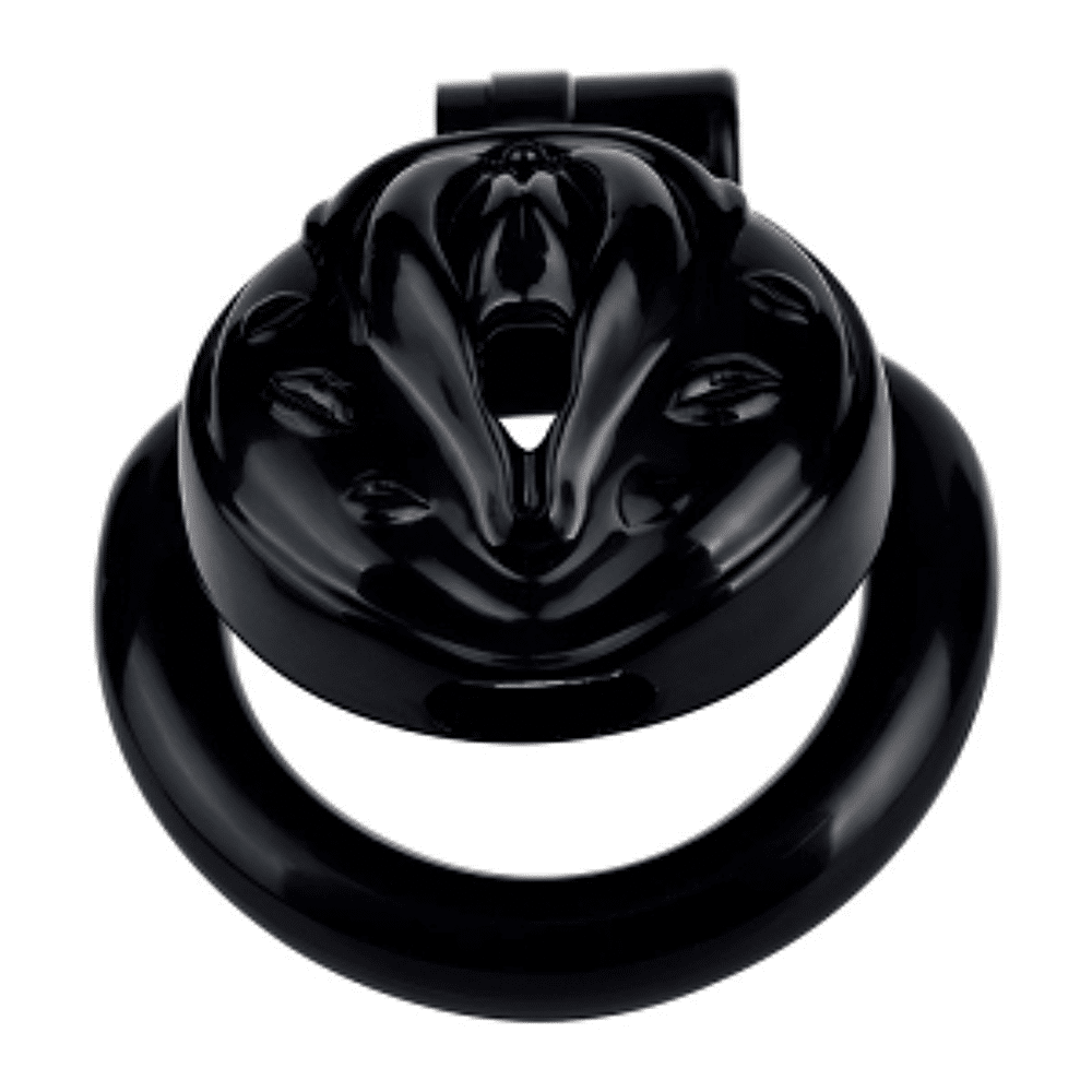 Stijve, open kuisheidskooi in de vorm van een vulva, met hangslot met sleutel en genummerd.