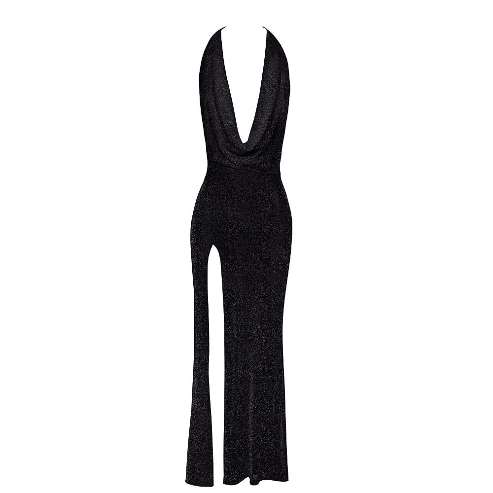 De jurk heeft een open rug versierd met een strass-bandje en een gedrapeerde halslijn die om de nek wordt geknoopt.