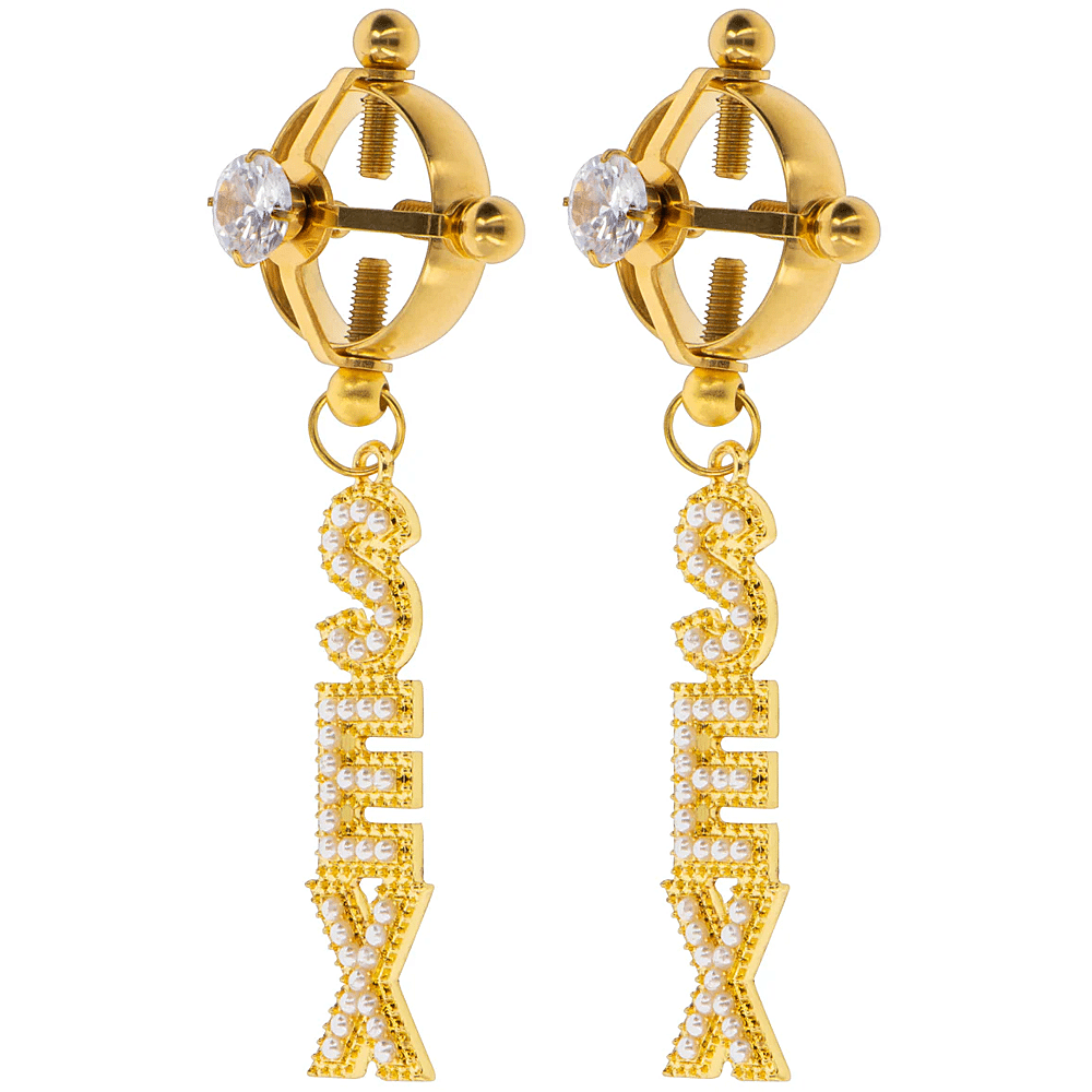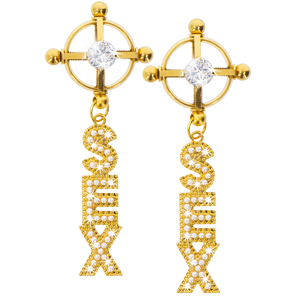 Ervaar de ongelooflijke sensaties die tepelklemmen bieden terwijl je twee echte sieraden draagt, versierd met strass en het woord “SEX”.