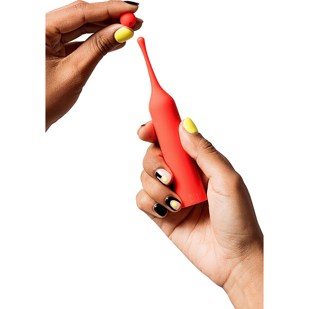 Pop is een hoogfrequente vibrator met een taps toelopende punt en twee verwisselbare koppen van glad silicone.